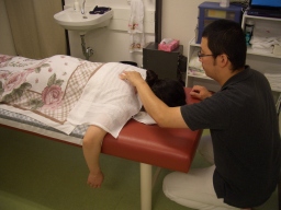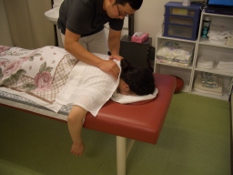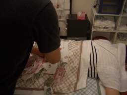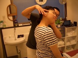 ②最初に首の施術からです。頭蓋骨のヘリから首筋、肩の付け根にかけて、指圧をしながらもみほぐしていきます。